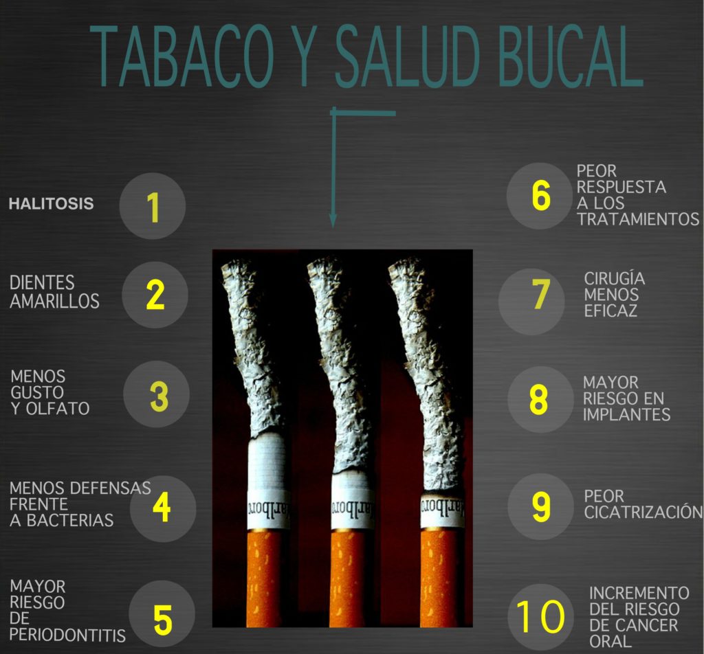 Algo que ya sabemos es que el tabaco de mascar puede conducir a una mayor tasa de cáncer oral, pero lo que las personas no saben es que fumar puede tener el mismo impacto y que además puede causar manchas en los dientes, una reducción en su capacidad de detectar sabor u olor a los alimentos , enfermedades de las encías, y una curación más lenta de las heridas corporales.