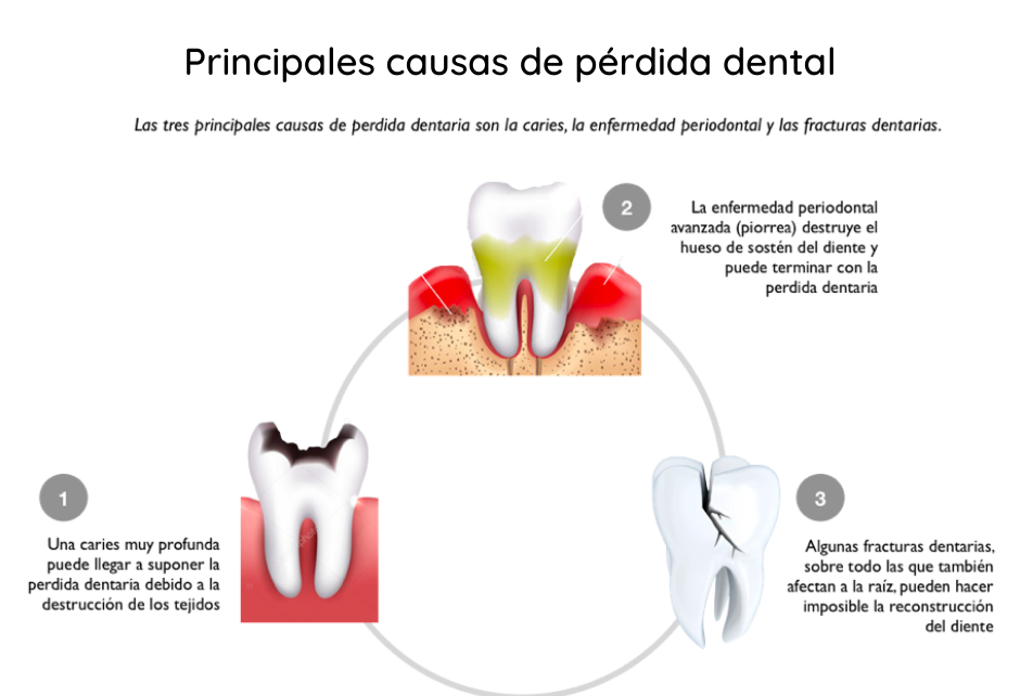 La caries y la enfermedad periodontal son dos de las causas más habituales de la pérdida de dientes. No llevar a cabo un control odontológico profesional del estado de su salud bucodental es una las principales razones por las que un adulto puede perder algunos de sus dientes. Esto supone que no se detectan posibles problemas bucodentales a tiempo para impedir que la enfermedad se desarrolle hasta provocar la caída del diente. Algunas de estas patologías pueden encontrarse en las encías, como la periodontitis o la gingivitis.